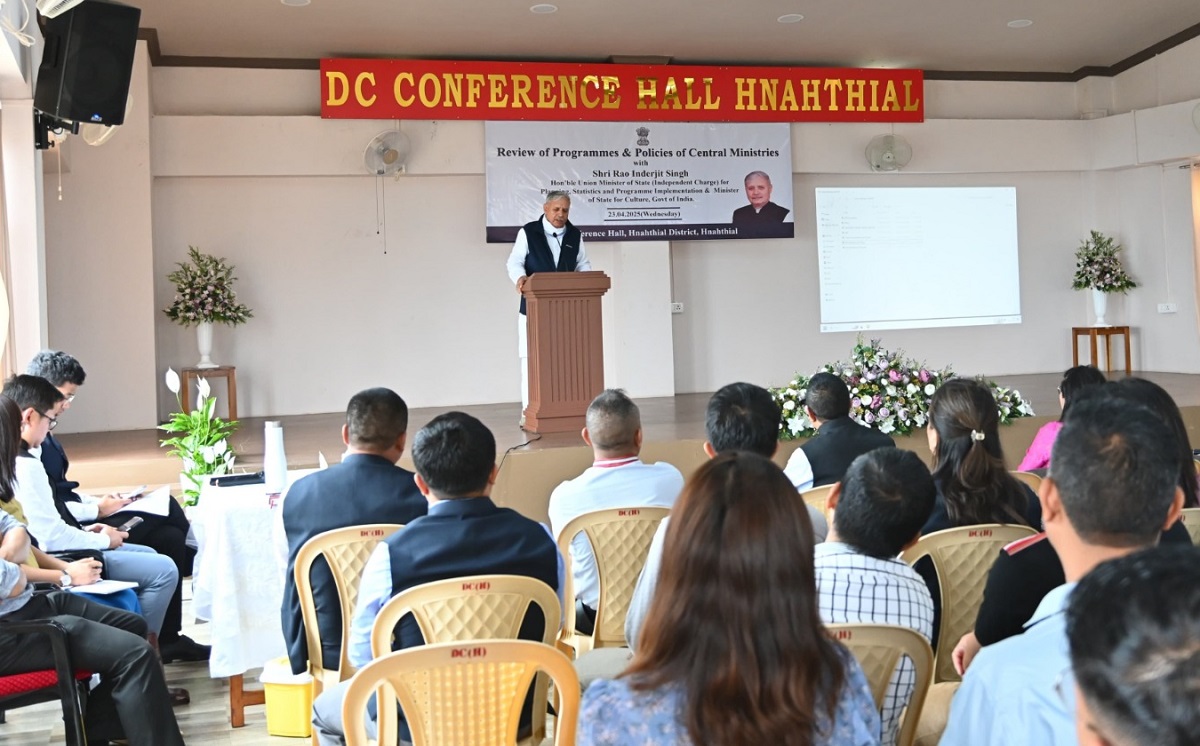 In his speech to the officials of Hnahthial District, Shri Rao Inderjit Singh praised the state of Mizoram as a whole for its maintenance of law and order, remarking it as one of the most peaceful states in India. Emphasising that the main purpose of his visit was to find out what is lagging in the central schemes and policies implemented, he stressed on the importance of the development of Hnahthial District and by extension, Mizoram as a whole. He reiterated that finding out what is needed for the development of North East regions is one of the main targets of the central ministries. As such, he hopes that the development of Hnahthial District will be one of the key factors in helping India become a developed nation. During the review programme, key officials from the Health & Family Welfare Department, Krishi Vigyan Kendra, Fisheries Department, Public Health Engineering, Rural Development Department, Education Department as well as Women and Child Development gave a presentation on how their respective central schemes are being implemented within Hnahthial District. Schemes such as PM POSHAN, PMMSY, JJM, MGNREGA, PMAY along with several other schemes were the topic of discussion during the programme.